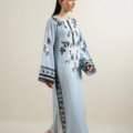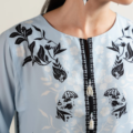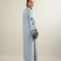 - “Crafted from soft printed crepe, this article features a crew neckline with a front slit, accented by bunch detailing on the elongated neck piping. Square armholes and full-length sleeves with lace insertions add refined structure, while lace detailing at the front hem and side slits complete the design with a graceful finish.