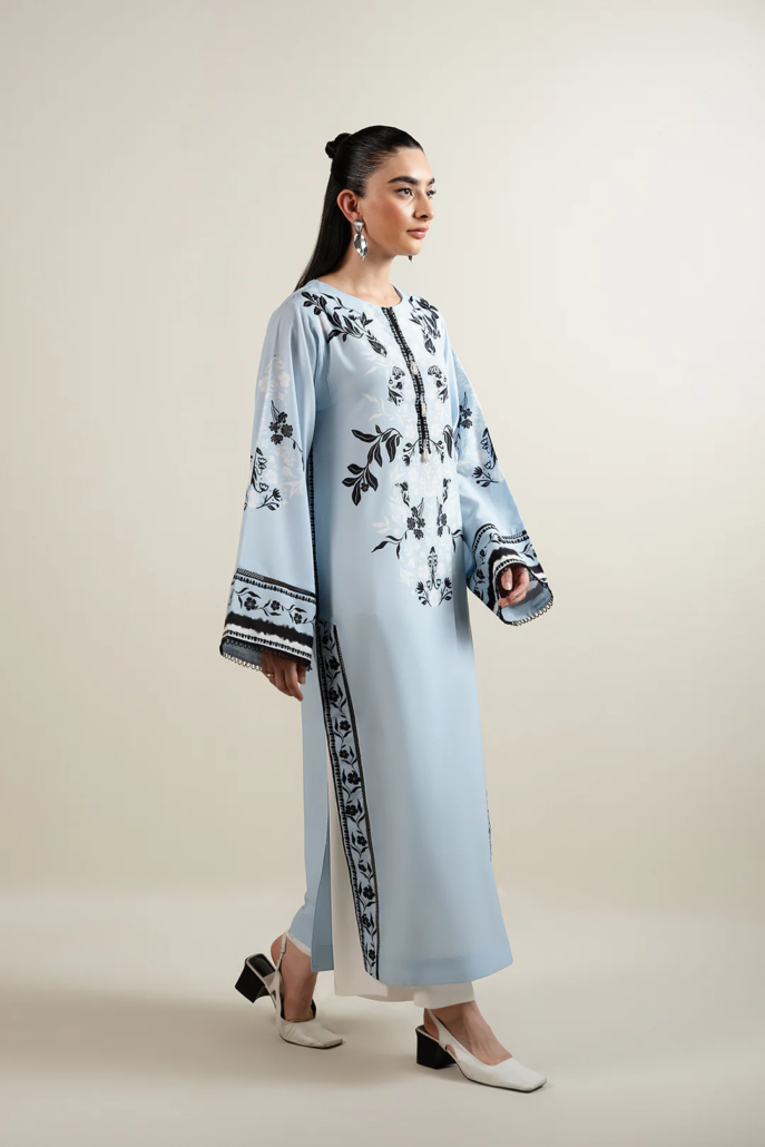 - “Crafted from soft printed crepe, this article features a crew neckline with a front slit, accented by bunch detailing on the elongated neck piping. Square armholes and full-length sleeves with lace insertions add refined structure, while lace detailing at the front hem and side slits complete the design with a graceful finish.