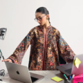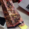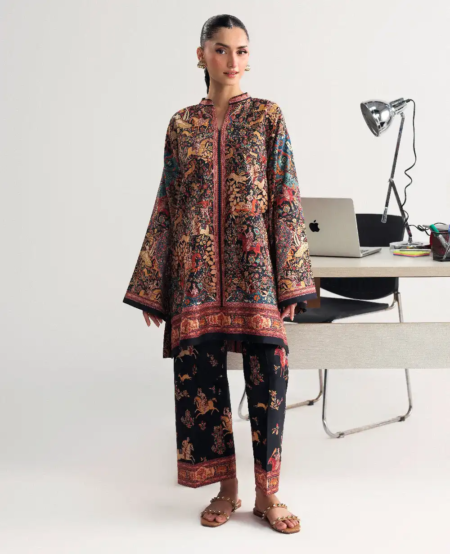 This design takes a cue from handwoven textile carpet with rich earthy tones, vines and motifs arranged in bold framed kurta with full sleeves paired with straight trouser, feels artistic and culturally stylish.