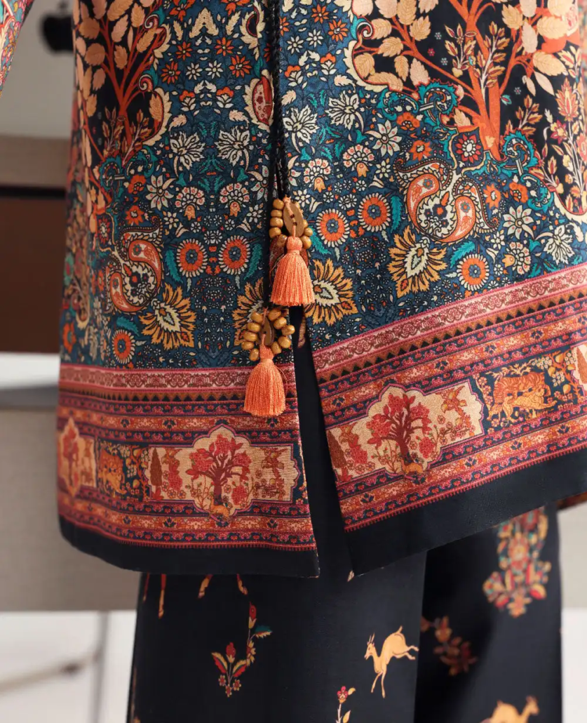 This design takes a cue from handwoven textile carpet with rich earthy tones, vines and motifs arranged in bold framed kurta with full sleeves paired with straight trouser, feels artistic and culturally stylish.