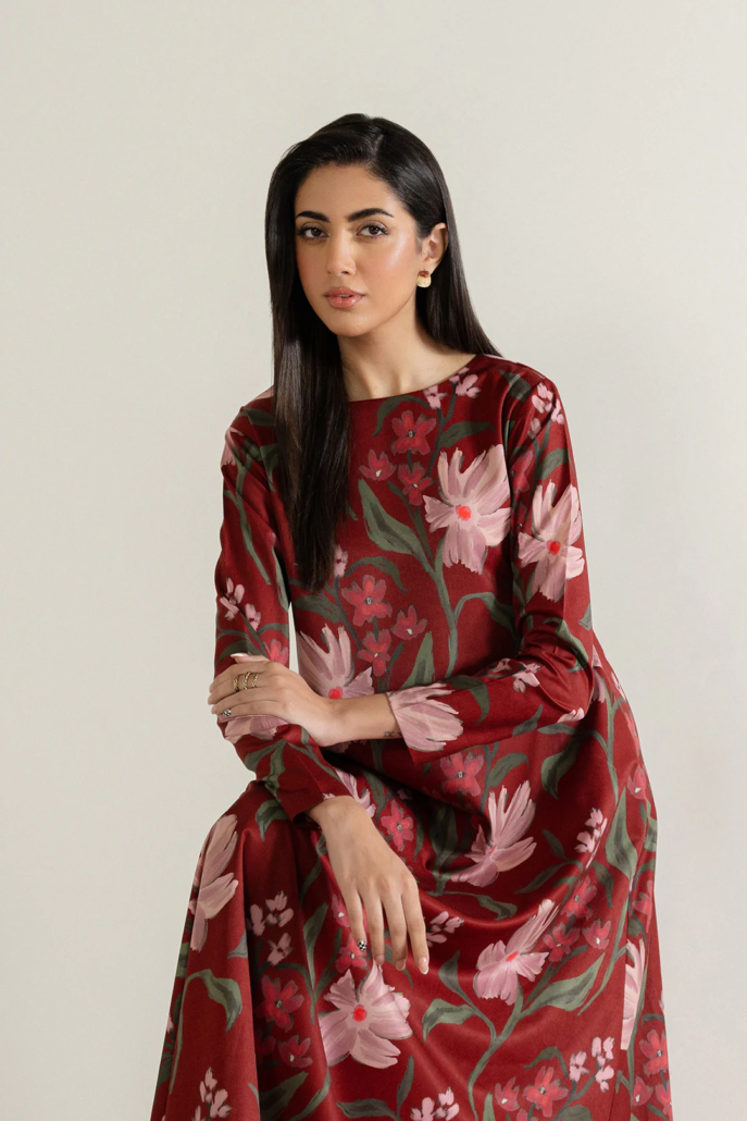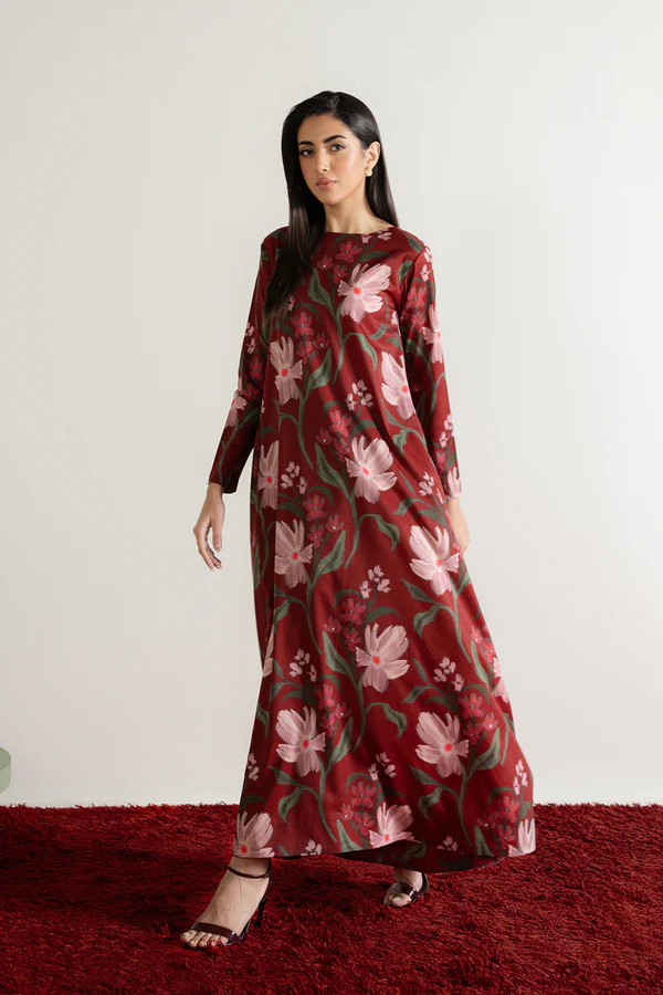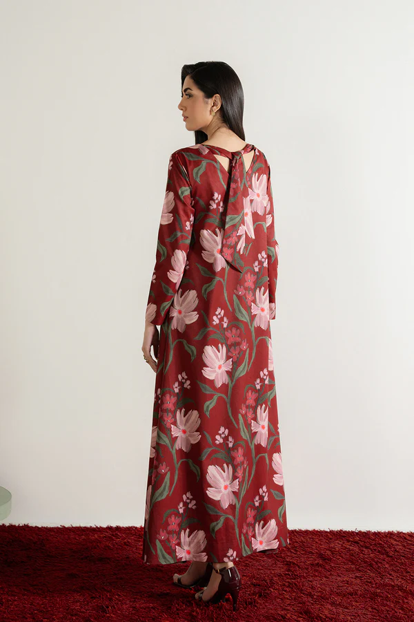 - This dress, made in soft crepe fabric, in floral print, features crew neckline on the front, tie-up detail & V-neck at the back, full length sleeves and flared hem.
