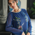 - A flared georgette chiffon dress in floral print, featuring crew neckline with crystal embellishment and a soft crystal spray across the front. Finished with full-length sleeves and an attached viscose lining.