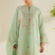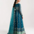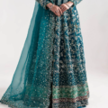 A 12-panelled pishwas in teal green color, with 6 panels at the front and 6 at the back. It features delicate silver embroidery and a floral design on the bodice. The outfit has a soft sage green satin border, along with two small borders in pink and teal, finished with delicate lace. The sleeves have silver embroidery and delicate lace as well. The organza dupatta is edged with sequin leaves. It comes with raw silk lehnga with lappa fabric in the end.