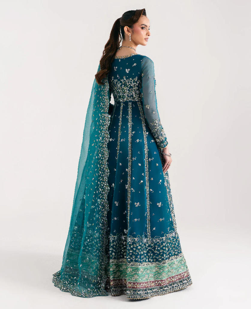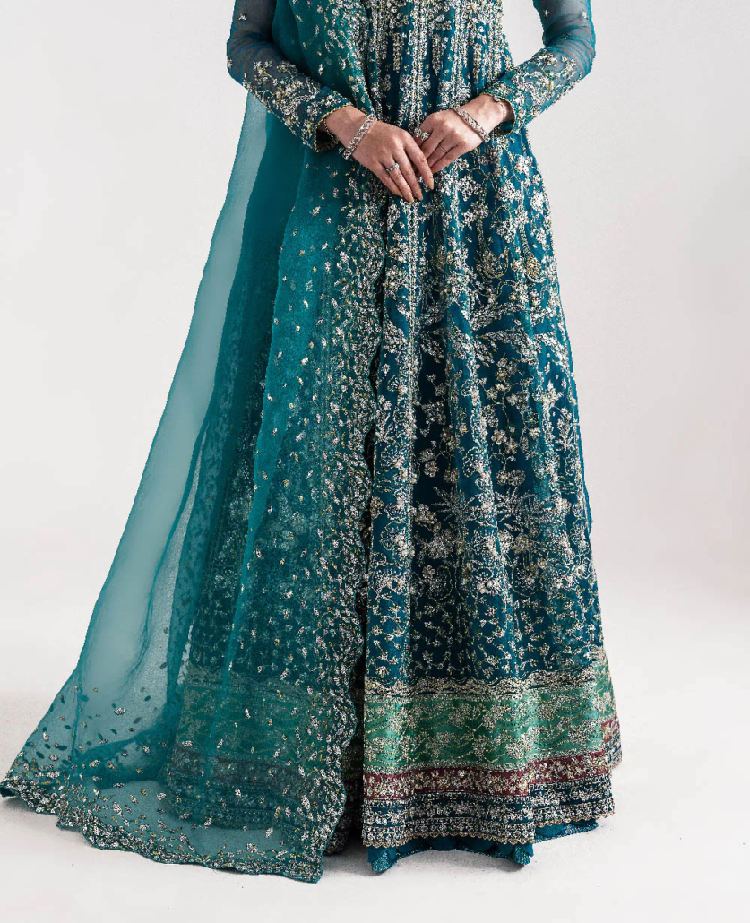 A 12-panelled pishwas in teal green color, with 6 panels at the front and 6 at the back. It features delicate silver embroidery and a floral design on the bodice. The outfit has a soft sage green satin border, along with two small borders in pink and teal, finished with delicate lace. The sleeves have silver embroidery and delicate lace as well. The organza dupatta is edged with sequin leaves. It comes with raw silk lehnga with lappa fabric in the end.