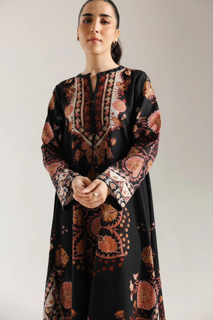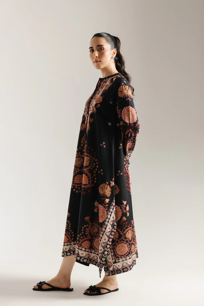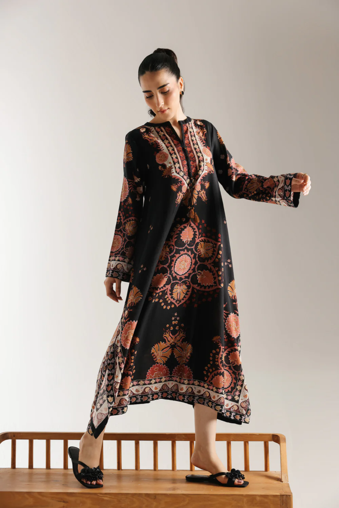 Envelop yourself in bohemian elegance. This captivating embroidered dress features a rich black base adorned with an intricate, all-over print in warm hues of terracotta, cream, and subtle green. The flowing silhouette is accentuated by beautifully detailed patterns that evoke a sense of global artistry, while the tassel-accented neckline adds a touch of playful sophistication. This dress is a statement piece, perfect for those who appreciate unique design and effortless grace.
