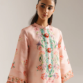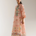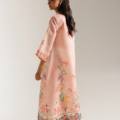 Envelop yourself in this breathtakingly beautiful printed dress. The luxurious fabric, in a delicate blush pink, is adorned with a stunning array of intricate floral motifs in soft shades of red, purple, and green. A beautifully embellished placket in contrasting teal and gold adds a touch of regal elegance. The relaxed silhouette and full-length design ensure both comfort and grace. This piece is a perfect choice for those special occasions where you want to radiate sophistication and charm.