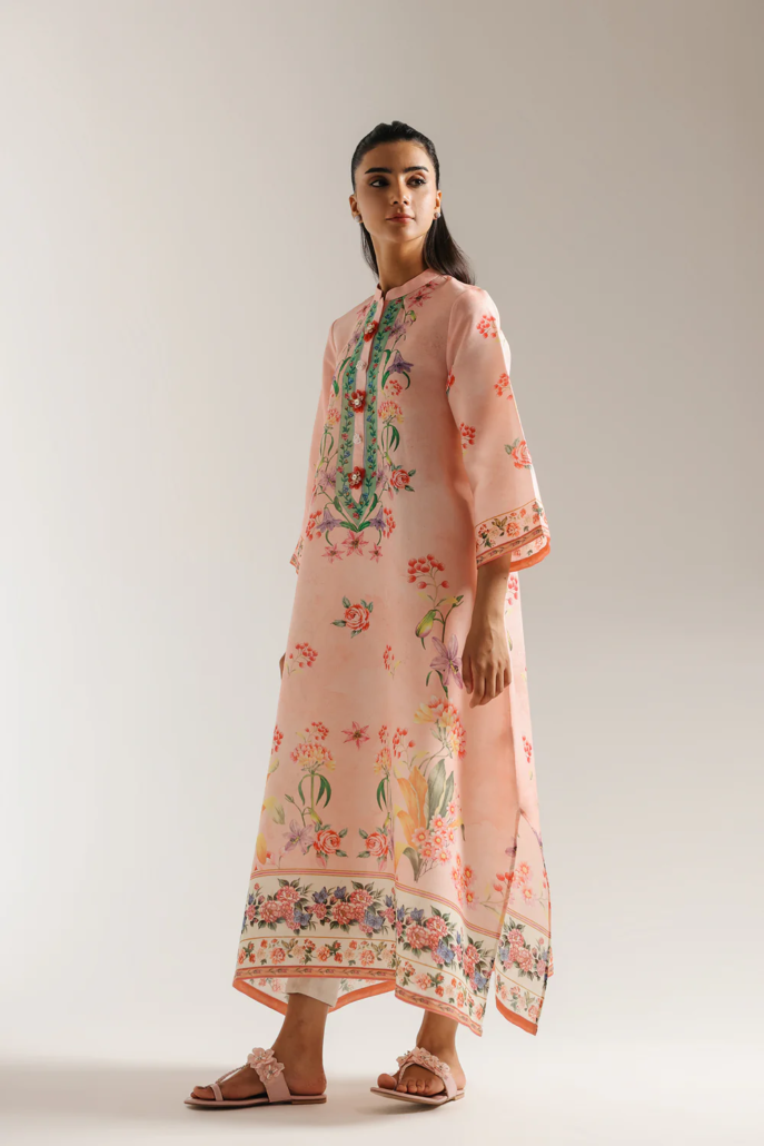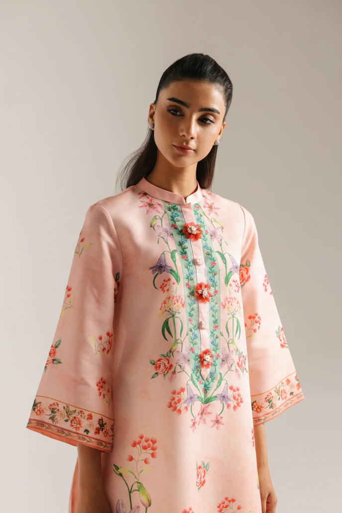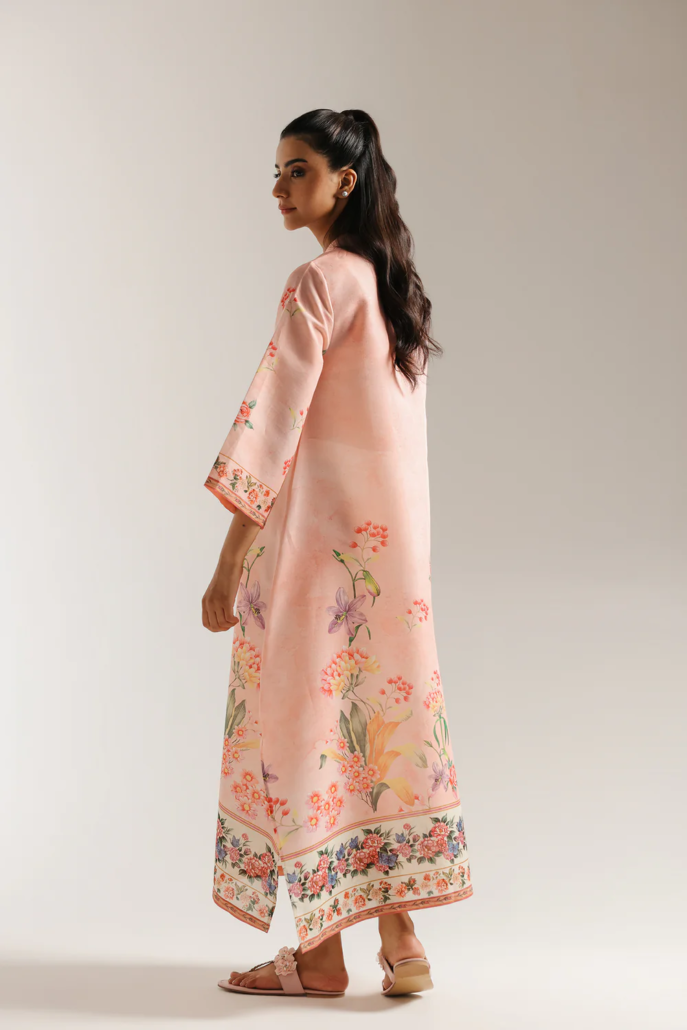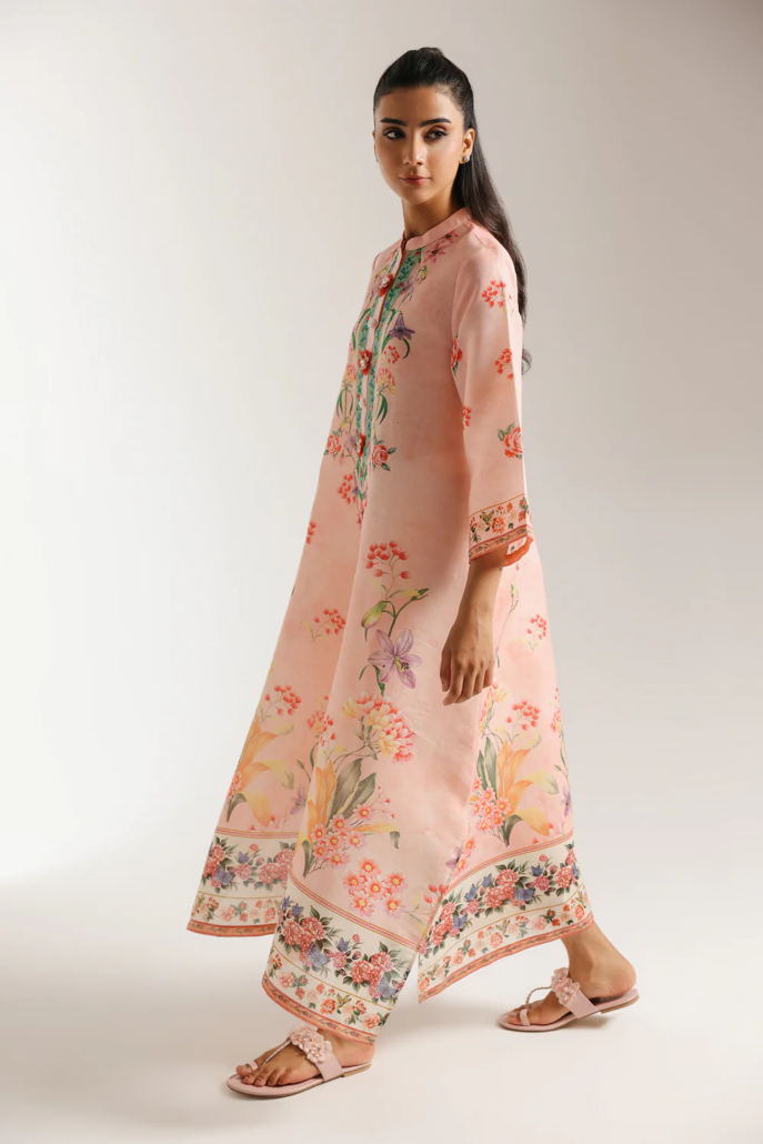 Envelop yourself in this breathtakingly beautiful printed dress. The luxurious fabric, in a delicate blush pink, is adorned with a stunning array of intricate floral motifs in soft shades of red, purple, and green. A beautifully embellished placket in contrasting teal and gold adds a touch of regal elegance. The relaxed silhouette and full-length design ensure both comfort and grace. This piece is a perfect choice for those special occasions where you want to radiate sophistication and charm.