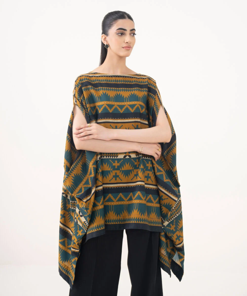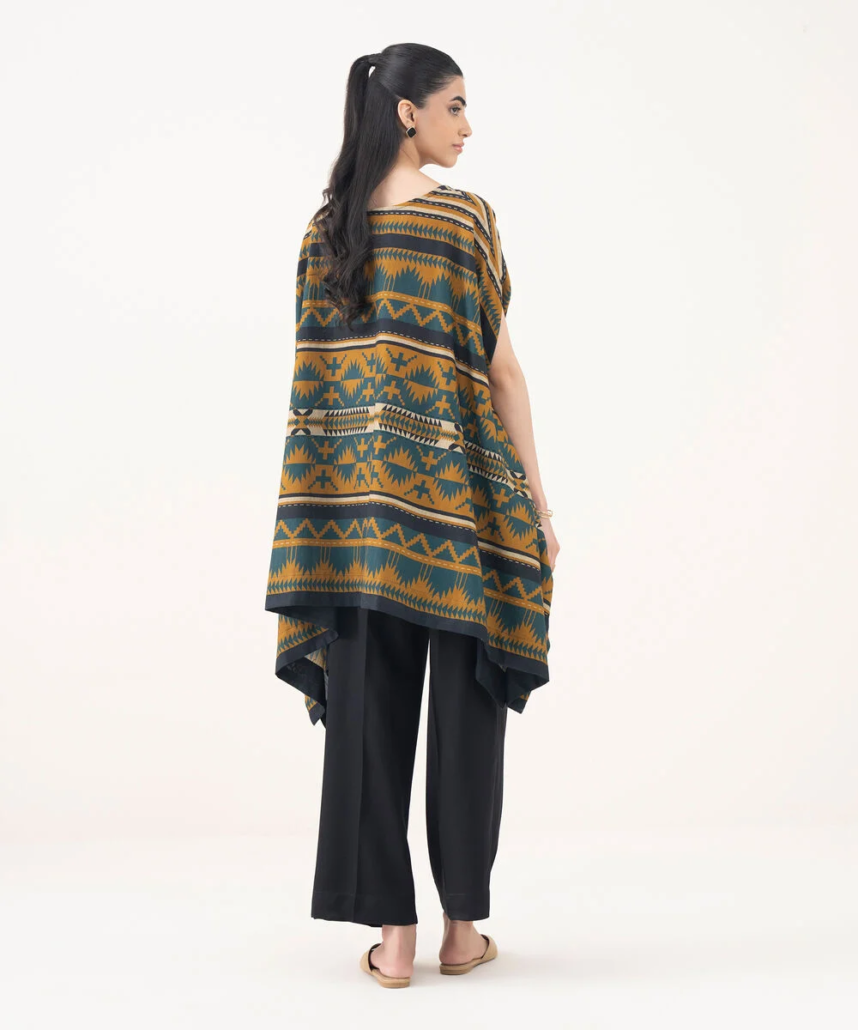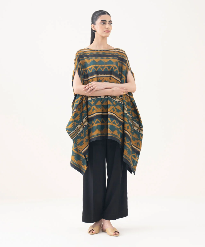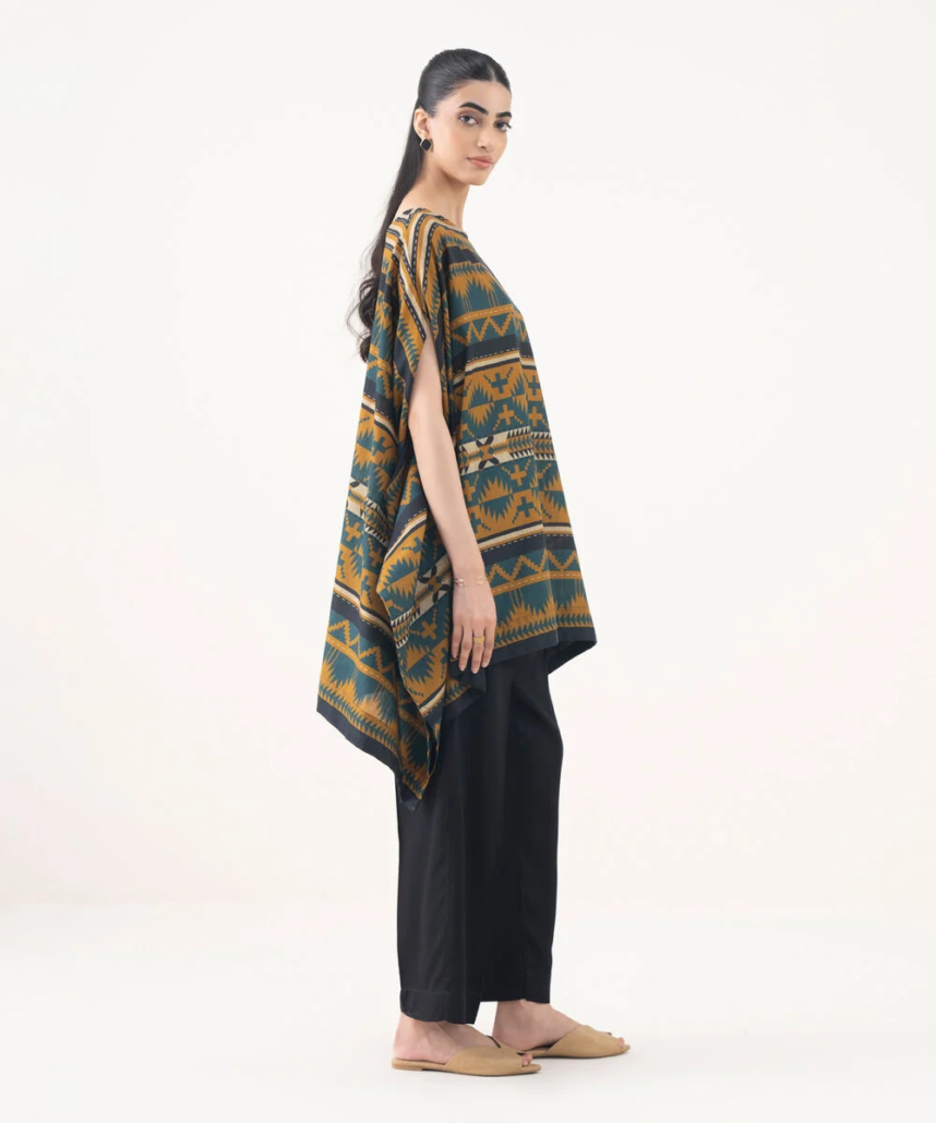 Upgrade your style in our printed mustard light khaddar kaftan featuring a boat neckline.