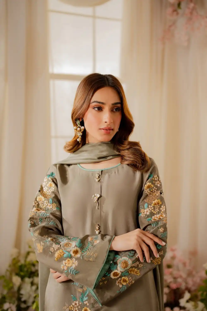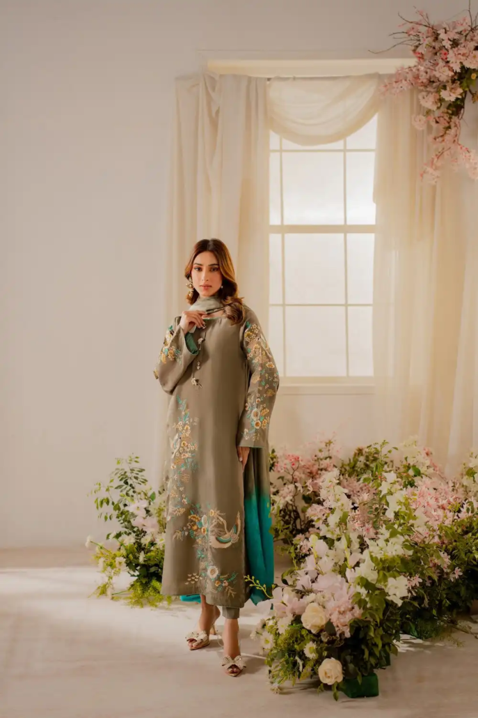 A vibrant ash silver grey ensemble features an elongated shirt adorned with our signature Vintage style birdie embroidery, with nature-inspired floral motifs. It features beautiful 3D motifs and intricate thread work with hints of sliver, light gold and tilla. This gorgeous shirt is paired with tonal trouser making it a classic timeless piece.