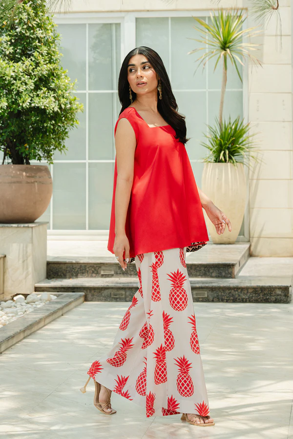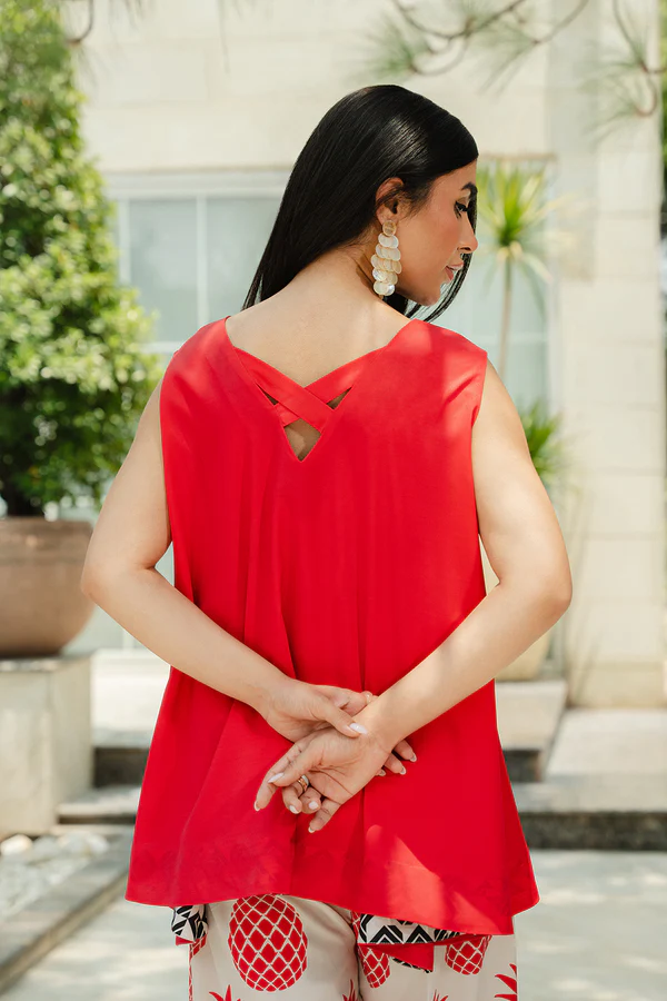- This sleeveless top, made in soft crepe fabric, features square neckline with cross-panel along the V-neck back and flared hem.