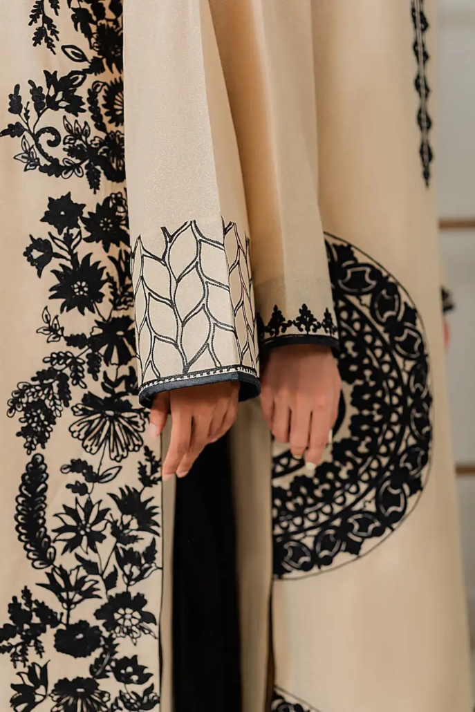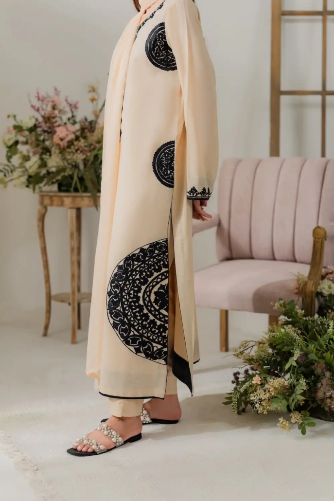 This refined off-white two-piece karandi outfit showcases the richness of traditional craftsmanship with a contemporary edge. The shirt features exquisite hand aari embroidery intricately worked all over in elegant shades of black, forming delicate patterns that add depth and contrast to the soft, textured fabric. The subtle interplay between the neutral base and bold embroidery creates a timeless, sophisticated look—ideal for both day and evening wear. A matching dupatta is available separately to complete this graceful ensemble.