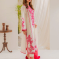 Step into understated grace with this beautifully crafted 2-piece lawn outfit in a serene off-white shade. Delicate pink embroidery blooms across the front, sleeves, and borders, adding a soft touch of color and feminine charm. The shirt features a straight-cut silhouette with finely detailed floral motifs, paired with a matching off-white trouser for a clean, cohesive look. Made from breathable lawn fabric, this ensemble is perfect for warm days when comfort and elegance go hand in hand. Ideal for casual gatherings or daytime events, it offers a timeless aesthetic with a hint of romantic flair.