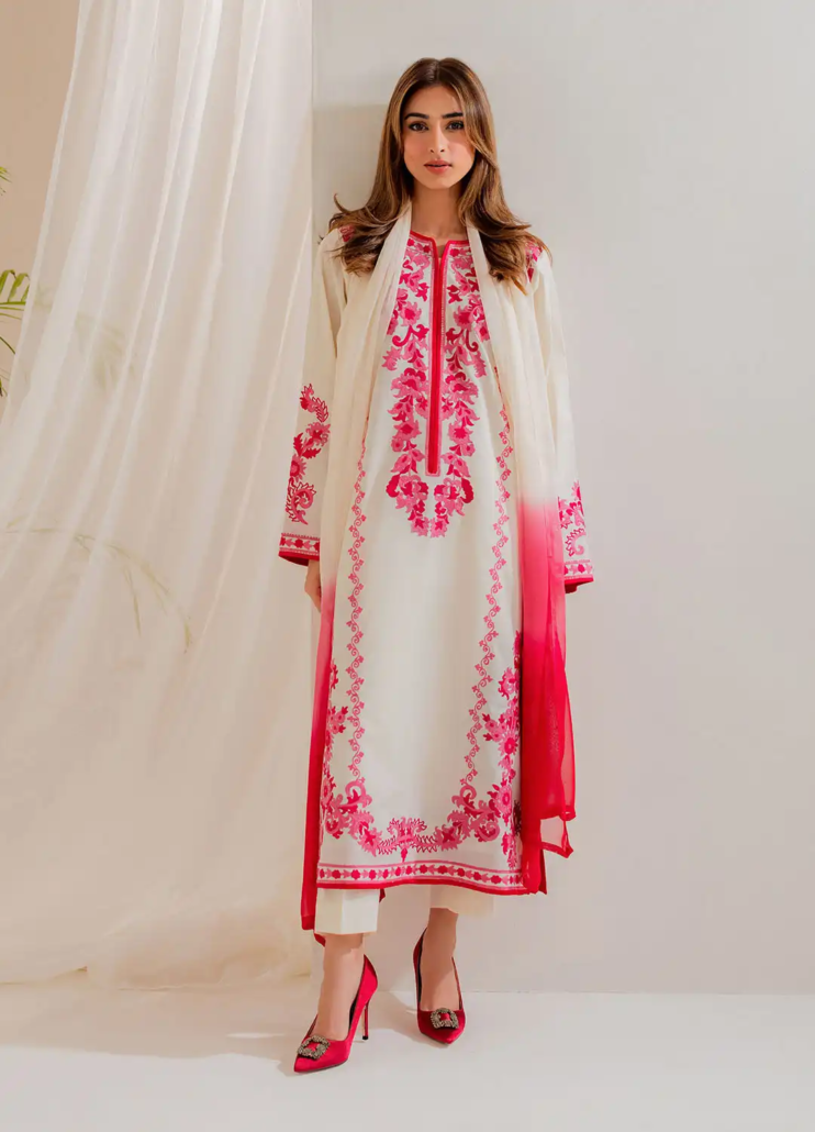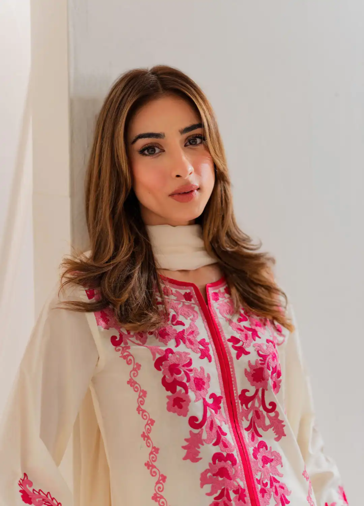 Step into understated grace with this beautifully crafted 2-piece lawn outfit in a serene off-white shade. Delicate pink embroidery blooms across the front, sleeves, and borders, adding a soft touch of color and feminine charm. The shirt features a straight-cut silhouette with finely detailed floral motifs, paired with a matching off-white trouser for a clean, cohesive look. Made from breathable lawn fabric, this ensemble is perfect for warm days when comfort and elegance go hand in hand. Ideal for casual gatherings or daytime events, it offers a timeless aesthetic with a hint of romantic flair.