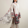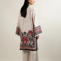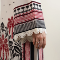 - Designed in printed crepe with ivory base, this article features an embellished V-neckline with a wavy organza cut and keyhole detail. Square armholes with lace insertions add structure, while flared sleeves trimmed with lace bring a feminine touch. Finished with side slits and a straight bottom for an elegant silhouette.