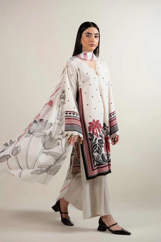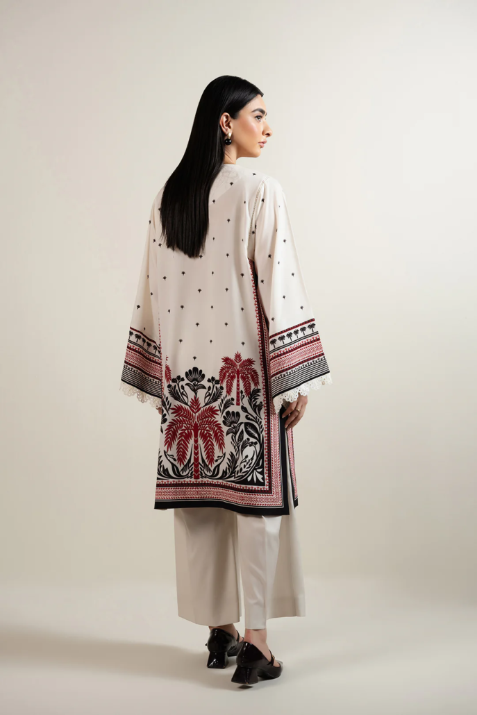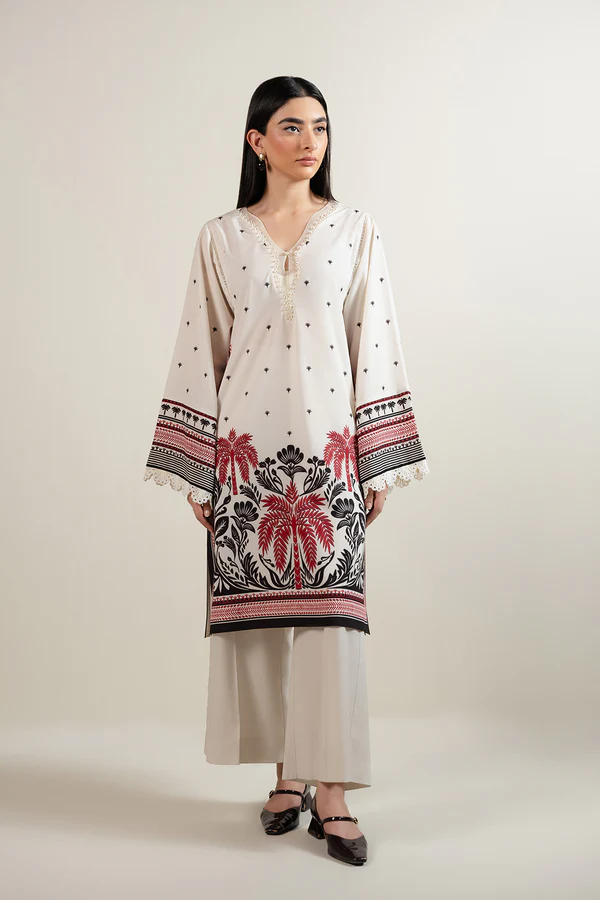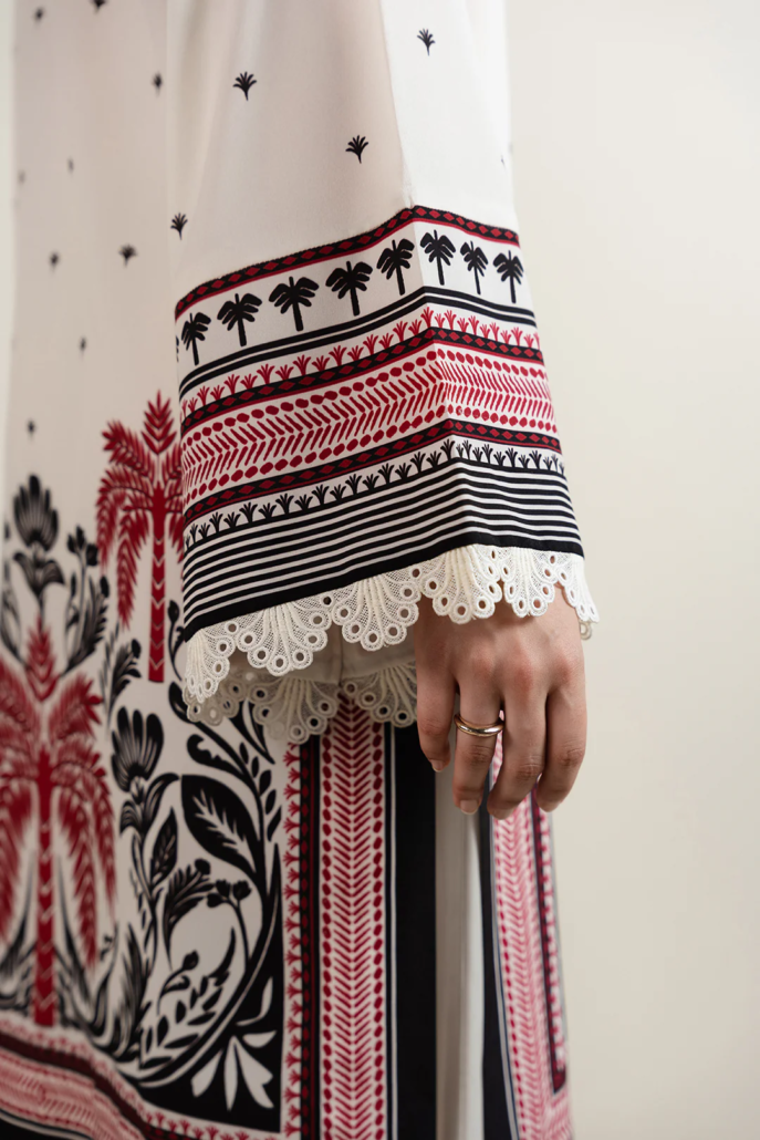 - Designed in printed crepe with ivory base, this article features an embellished V-neckline with a wavy organza cut and keyhole detail. Square armholes with lace insertions add structure, while flared sleeves trimmed with lace bring a feminine touch. Finished with side slits and a straight bottom for an elegant silhouette.