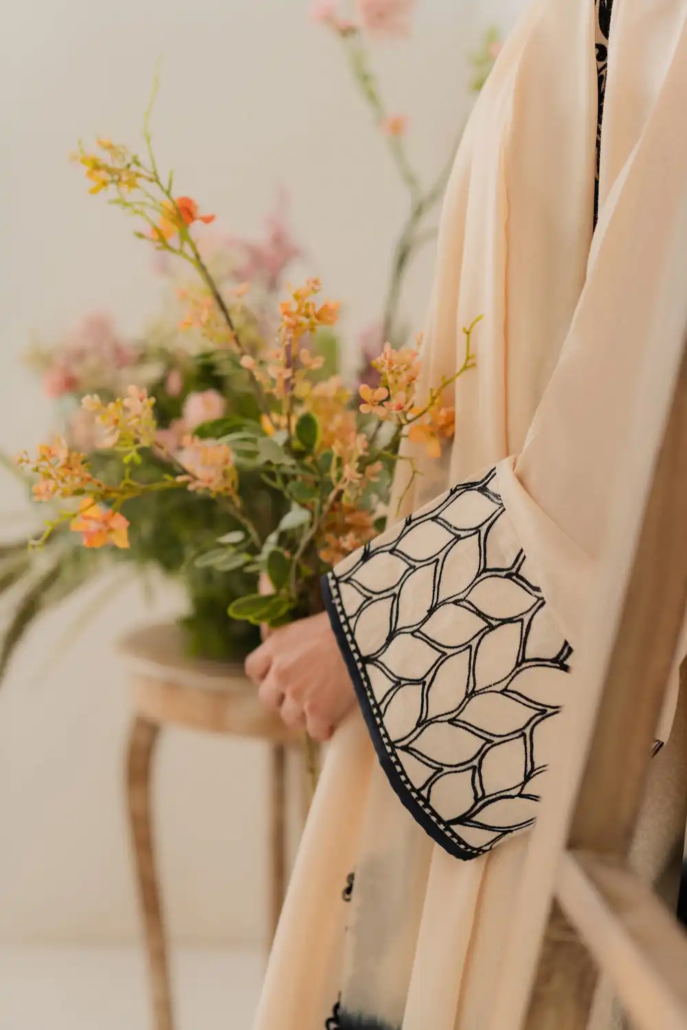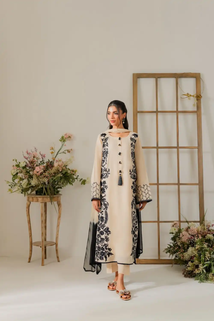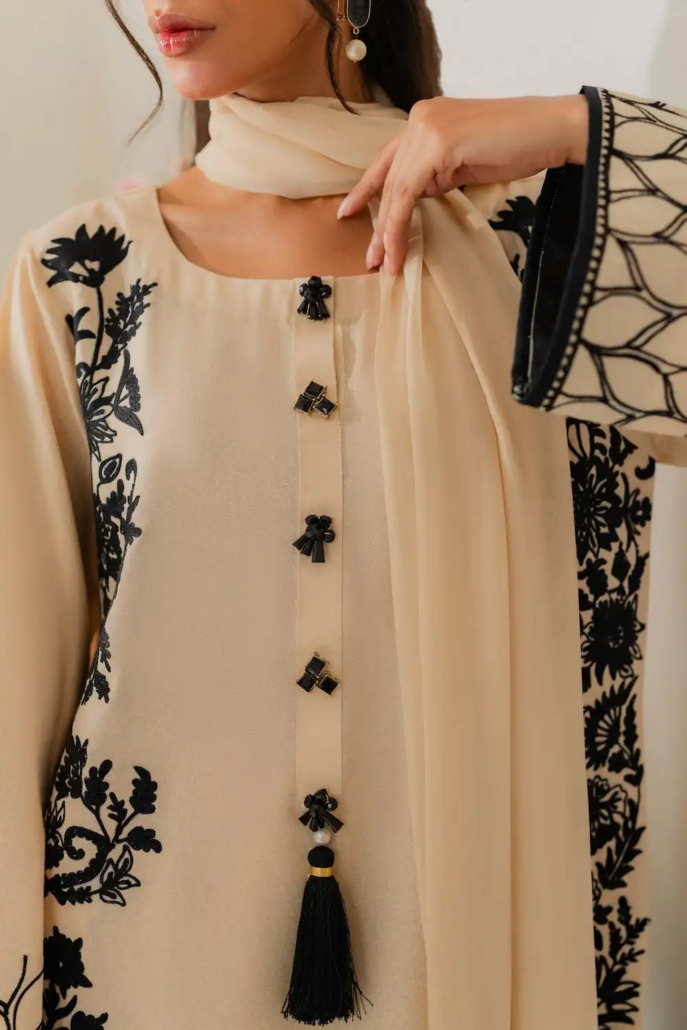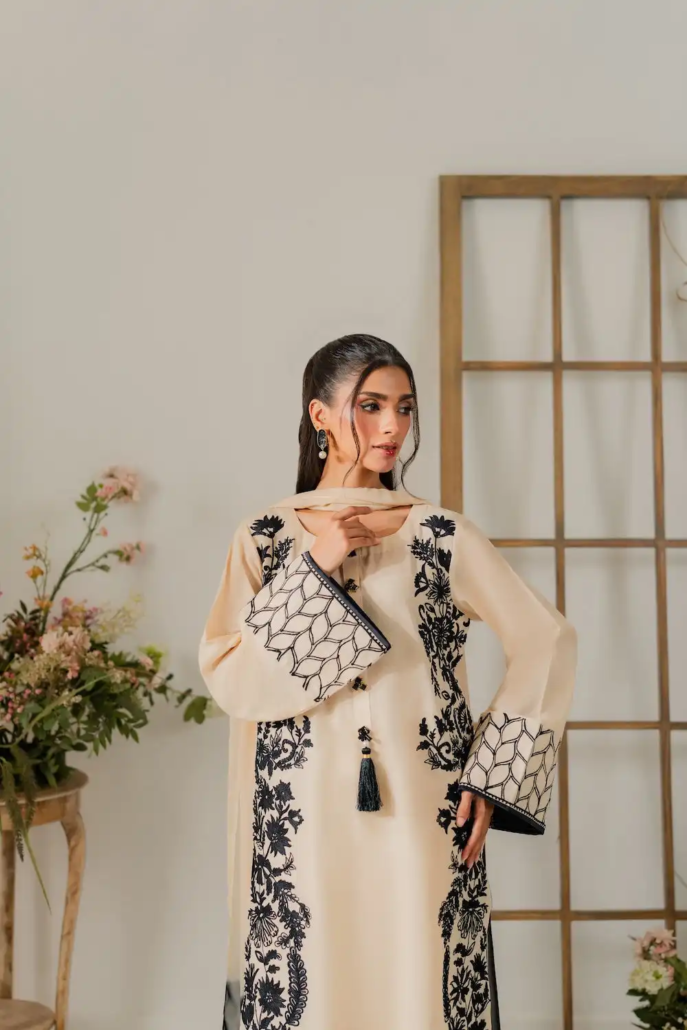 This elegant off-white two-piece karandi outfit is a celebration of timeless craftsmanship and subtle luxury. The shirt is adorned with exquisite hand aari embroidery delicately spread across the fabric. The beauty of the ensemble is further elevated with handmade embellishments and dainty tassels along the neckline, adding texture and artisanal charm. The soft karandi fabric provides a structured yet comfortable fit, perfect for both festive and semi-formal occasions. A two-toned dupatta is available separately, designed to complement and complete the look with understated elegance.