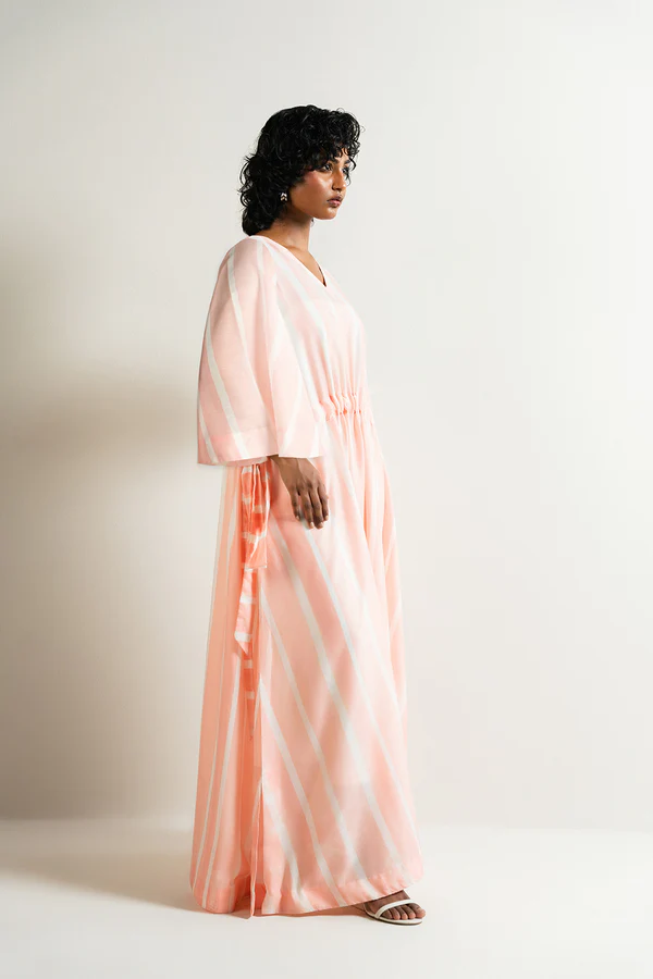 - This striped dress made in air-weave fabric features a v-neck, Full sleeves, flared bottom and side slits. The dress has a tie-up detail on waist.