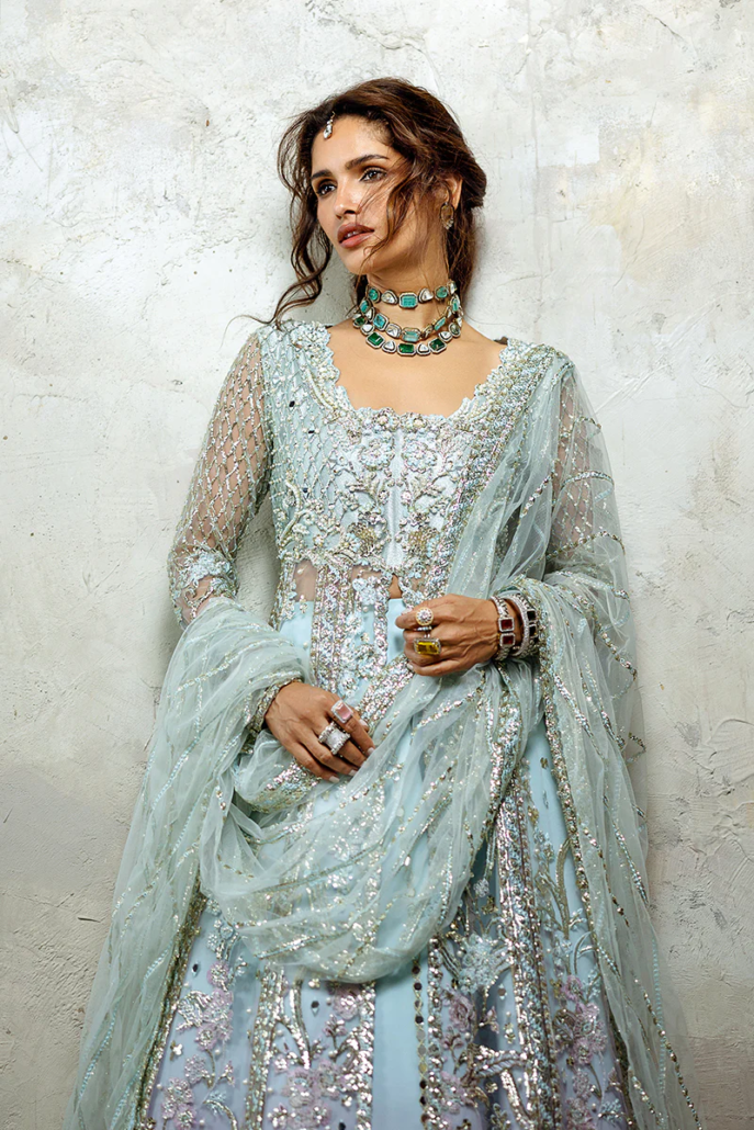 Grace yourself in the beauty of timeless elegance with “Silver Screen”. This ensemble features intricate hand-embellished embroidery and sequins on net fabric, complemented by a gradient-printed lehenga with sequinned organza lace. The sequinned net dupatta, handmade tassels, and mirror lace finishing add an ethereal charm, making Silver Screen a design meant to celebrate you in every moment.