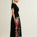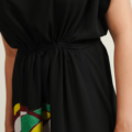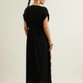 - Crafted in soft black crepe, this dress features a classic crew neckline with a subtle front slit. The front is adorned with a printed patch and delicate gathers enhanced by adjustable cord detailing offering a blend of structure and fluidity for a modern, elevated look.