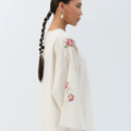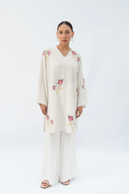 - This embroidered beige top made in soft crepe fabric features V-neck, batwing sleeves, side slits and round hem.