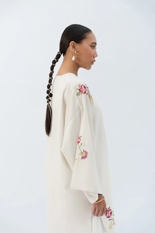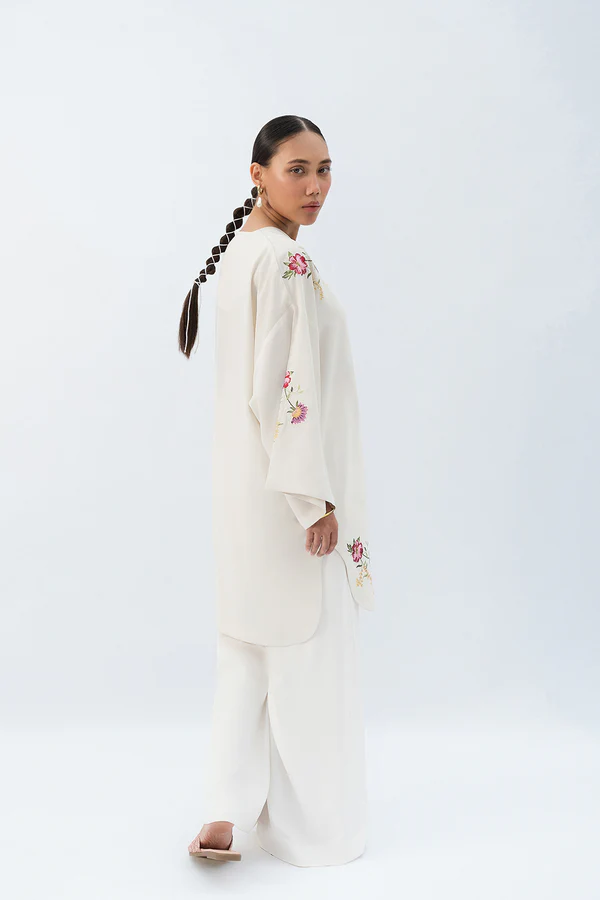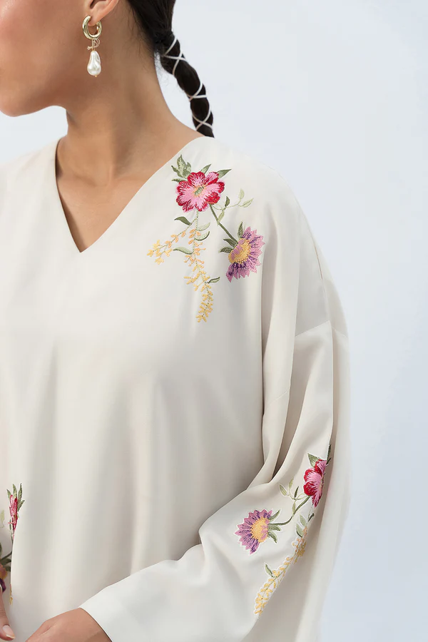 - This embroidered beige top made in soft crepe fabric features V-neck, batwing sleeves, side slits and round hem.