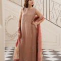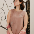 - This sleeveless top, made in soft organza fabric, features crew neckline adorned with crystal embellishment and crystal motif spray along the front, hook & eye closure with slit at the back, side slits with pearl insertion along the seam and straight hem with pearl hangings.