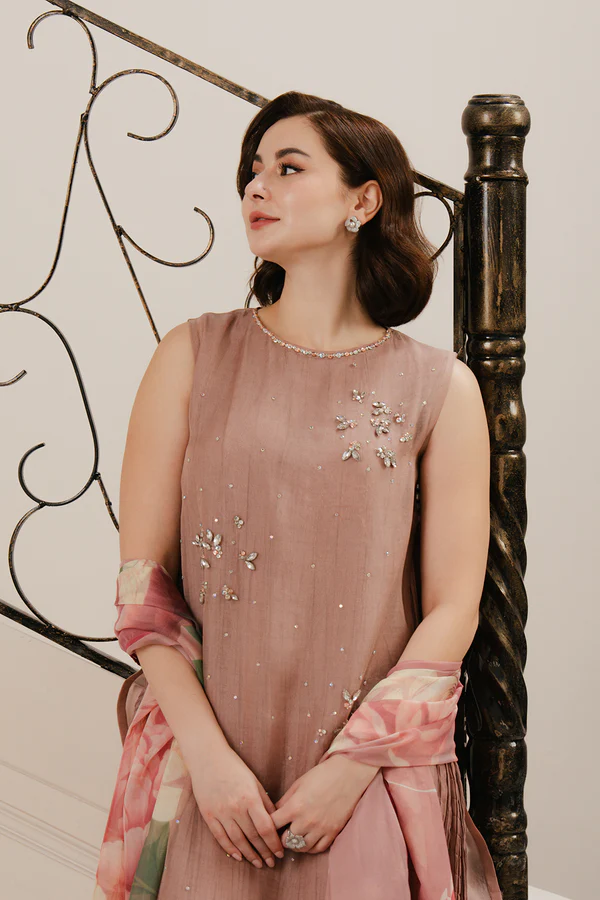 - This sleeveless top, made in soft organza fabric, features crew neckline adorned with crystal embellishment and crystal motif spray along the front, hook & eye closure with slit at the back, side slits with pearl insertion along the seam and straight hem with pearl hangings.