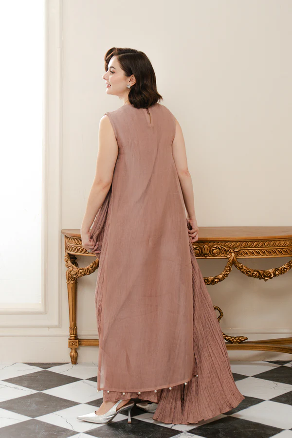 - It comes with a sleeveless underdress made in crushed viscose fabric featuring crew neckline with hook & eye closure at the back and flared hemline.