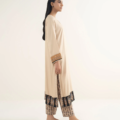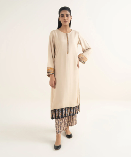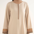 Upgrade your style in our dyed beige textured viscose A-line shirt featuring a round neckline with placket.
