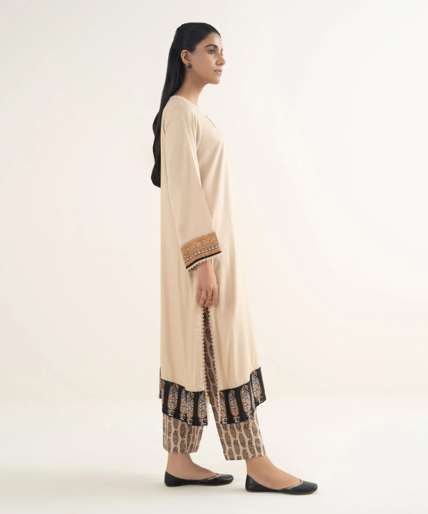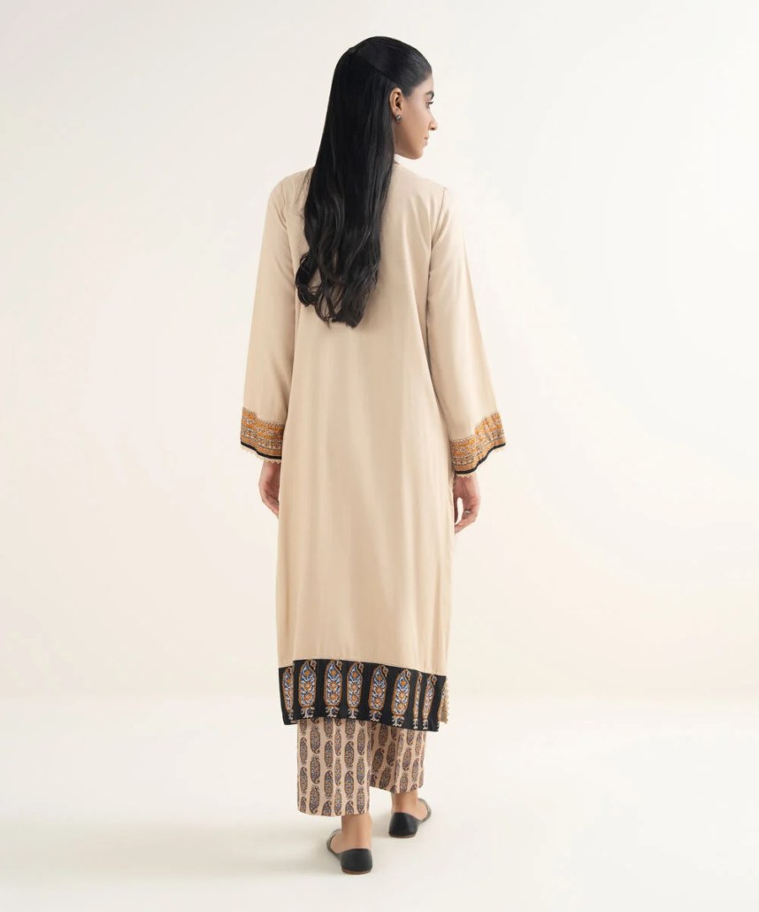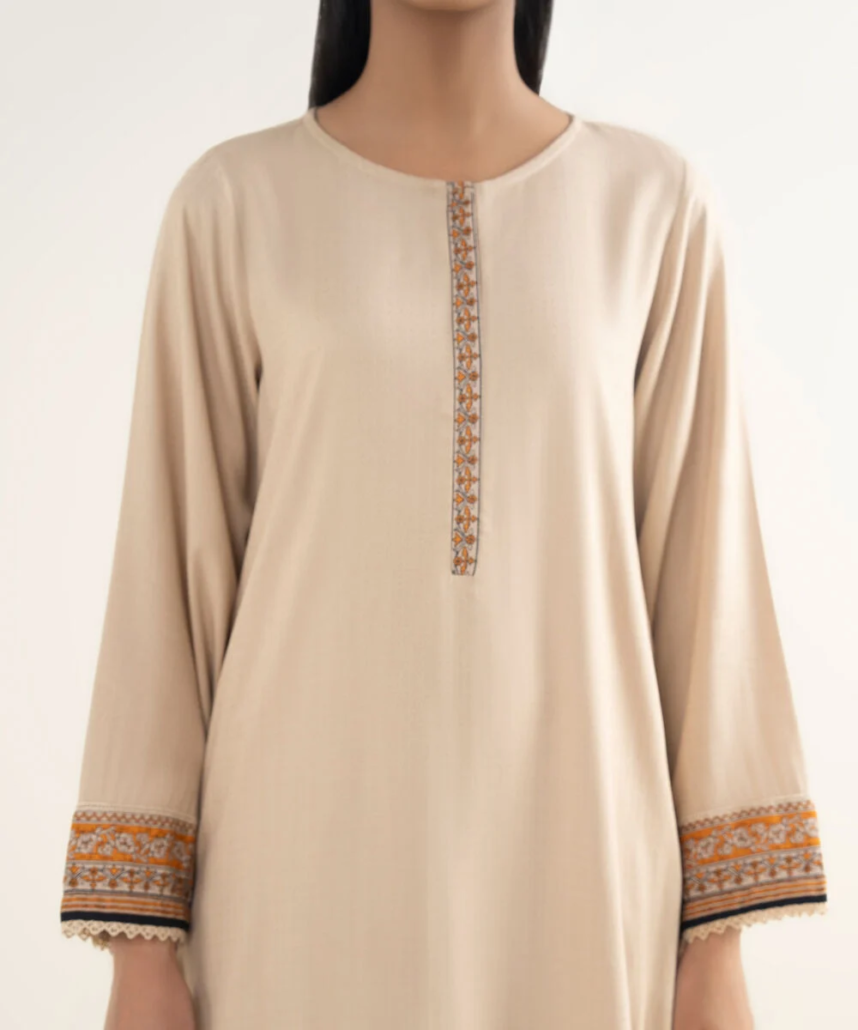 Dyed With Printed Accent And Lace Finish Front Panel, Dyed With Printed Accent Back Panel, Round With Placket Neckline, Full Sleeves, Long Length