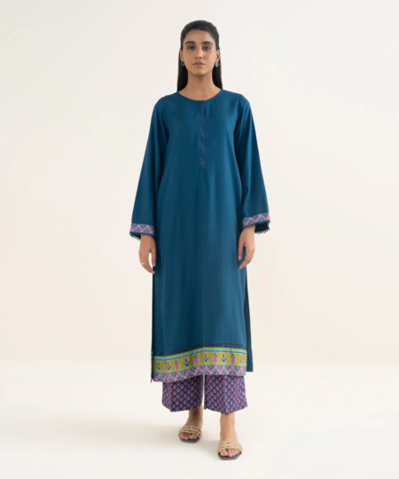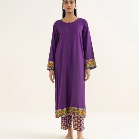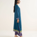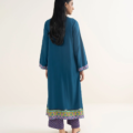 Dyed With Printed Accent And Lace Finish Front Panel, Dyed Back Panel, Round With Placket Neckline, Full Sleeves, Long Length