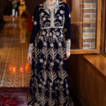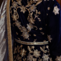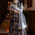 It captures the essence of luxury with its beautifully embroidered and sequined velvet details. From the opulent front and back yokes to the exquisite organza borders, every stitch tells a story of craftsmanship and style.