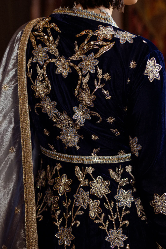 It captures the essence of luxury with its beautifully embroidered and sequined velvet details. From the opulent front and back yokes to the exquisite organza borders, every stitch tells a story of craftsmanship and style.