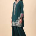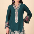 Verdance – Turn heads with this ultra-chic dark green short shirt, featuring a trendy round hem and paired with a stylish shalwar for a modern, effortless vibe. Intricate blooming floral embroidery along the hem and a beautifully crafted neckline with pops of maroon, mustard, and sage elevate this look with a touch of sophistication.