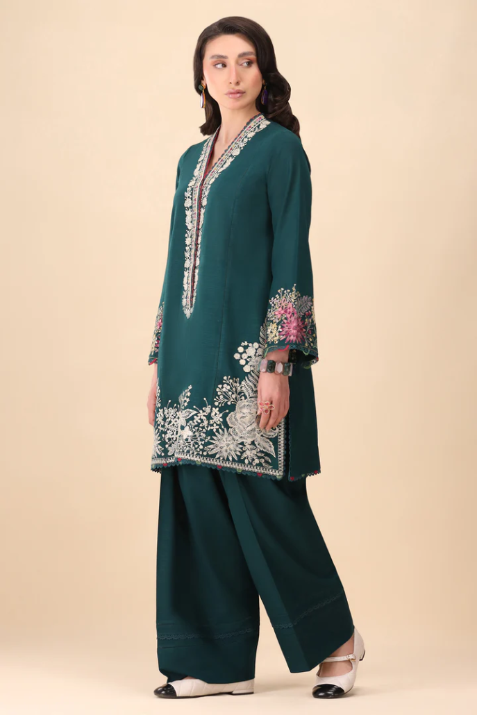 Verdance – Turn heads with this ultra-chic dark green short shirt, featuring a trendy round hem and paired with a stylish shalwar for a modern, effortless vibe. Intricate blooming floral embroidery along the hem and a beautifully crafted neckline with pops of maroon, mustard, and sage elevate this look with a touch of sophistication.