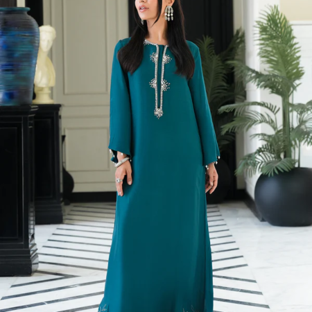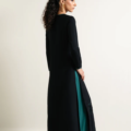 - Crafted from black crepe, this piece is designed with an embroidered front and a crew neckline, complemented by contrast piping along the neck, center front, and sleeve openings. It features full-length sleeves, high side slits, and organza inserts with laser-cut multihead embroidery at the hem, offering a sophisticated and refined finish. Pair it with ‘Yarae pants’ to complete the look.