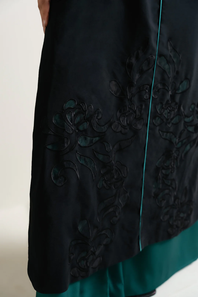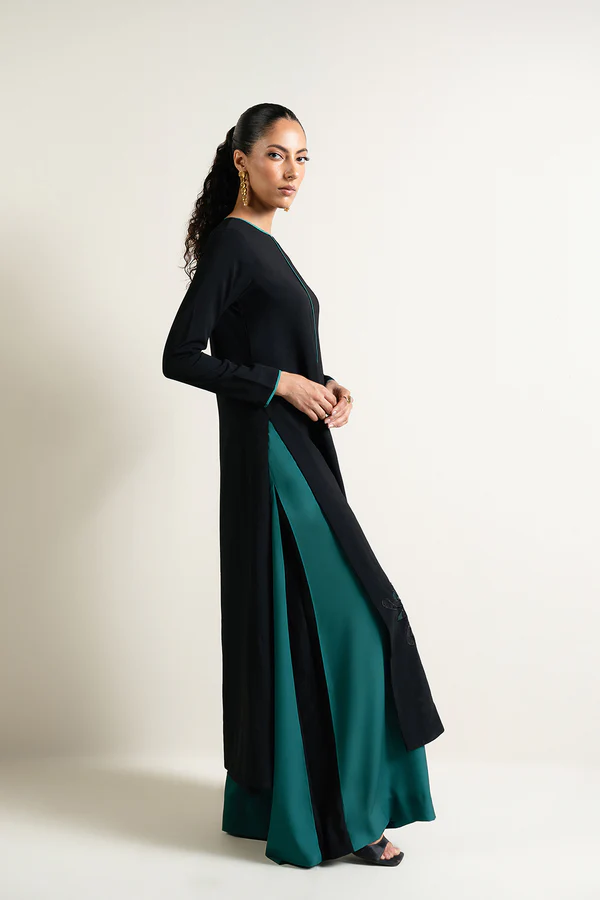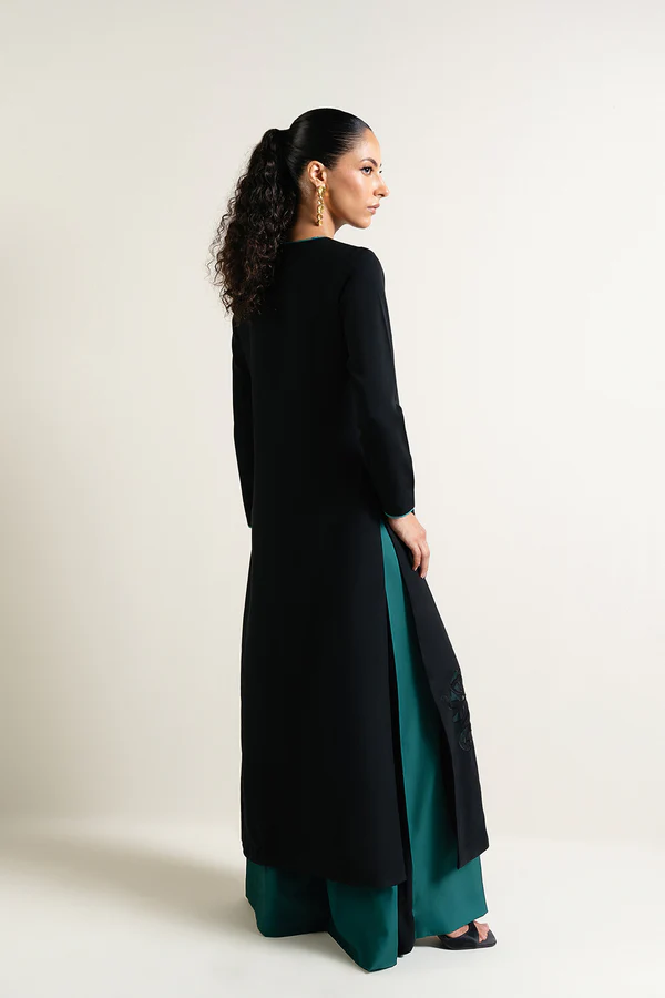 - Crafted from black crepe, this piece is designed with an embroidered front and a crew neckline, complemented by contrast piping along the neck, center front, and sleeve openings. It features full-length sleeves, high side slits, and organza inserts with laser-cut multihead embroidery at the hem, offering a sophisticated and refined finish. Pair it with ‘Yarae pants’ to complete the look.