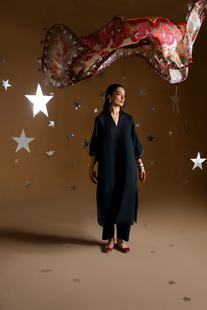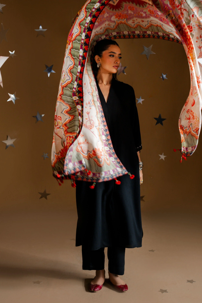 Like autumn nights draped in quiet mystery, Zareen flows in obsidian-hued karandi, paired with matching pants for an unhurried, graceful silhouette. Delicate embroidered cross motifs trace the sleeves, adding a touch of timeless refinement to its minimal charm.