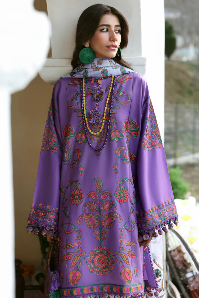 Zariah – A poetic fusion of tradition and modernity, this amethyst-hued masterpiece is adorned with intricate tribal paisley embroideries, weaving timeless artistry into contemporary sophistication. The ethereal soft lilac cotton net dupatta, framed with exquisitely embroidered paisley borders, drapes like a dream, adding an effortless allure to every step. Paired with printed dove-colored trousers, this ensemble is light, feminine, and undeniably chic—a sartorial ode to the Zaha girl who embodies culture with an effortlessly modern twist.