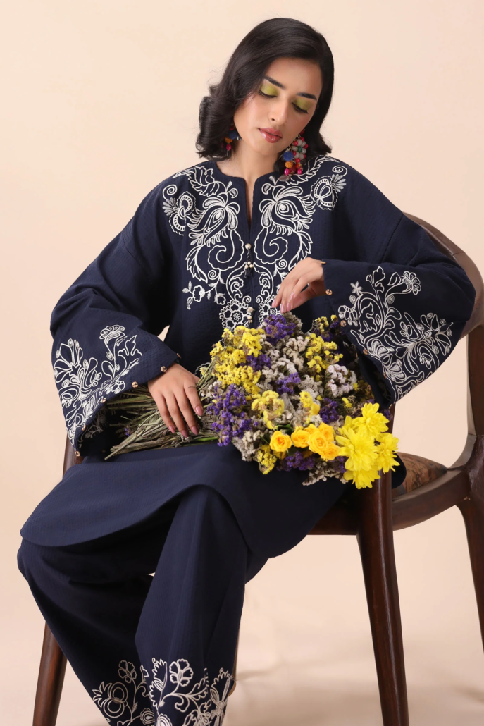 Zarif — where effortless street-smart cool meets boho artistry, crafted for the Zaha girl who turns every moment into a statement. This textured midnight blue coord set is a celebration of boldness and grace, with delicate ivory chain stitch botanical embroideries that dance along the neckline and bloom on the sleeves, while earthy-toned buttons with thread details add that signature handcrafted charm.