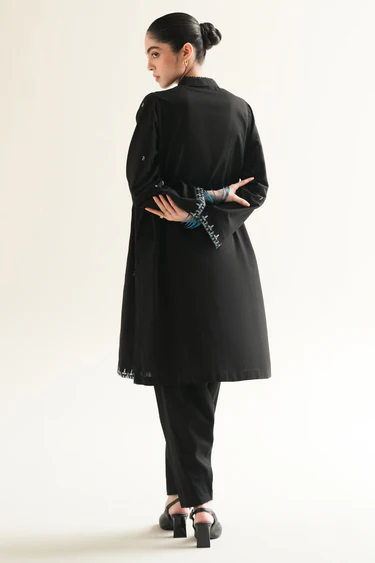 This black kurta features intricately embroidered panels, styled with a tapered shalwar in Irish linen for a look that is both classic and contemporary.