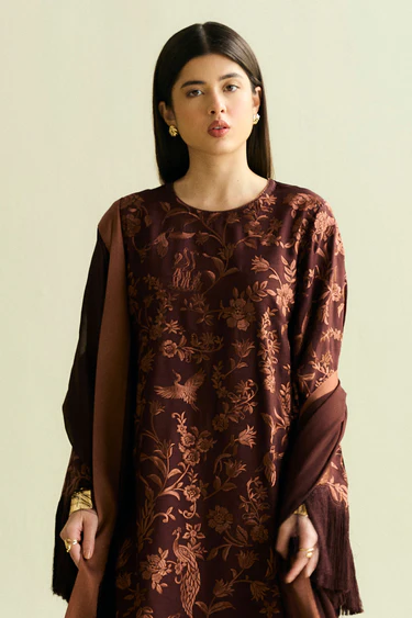 • Shirt: The shirt is crafted from a rich, luxurious fabric with a deep, warm brown base that provides a sophisticated, earthy undertone. The rust-colored gara embroidery is meticulously done that stands out beautifully against the dark brown fabric, creating a stunning visual appeal. The sleeves of the shirt are a standout feature, drawing attention with bold tassel details.