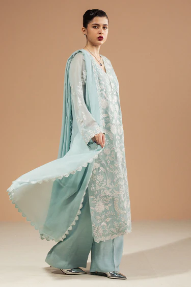 This aqua-colored ensemble effortlessly creates a look that is both graceful and luxurious.