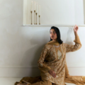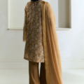 An ash brown ensemble that blends a modern silhouette with traditional artistry—elegant, understated, and enduring.