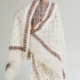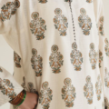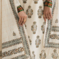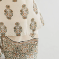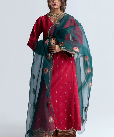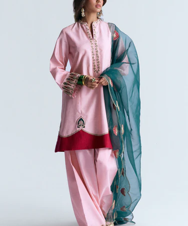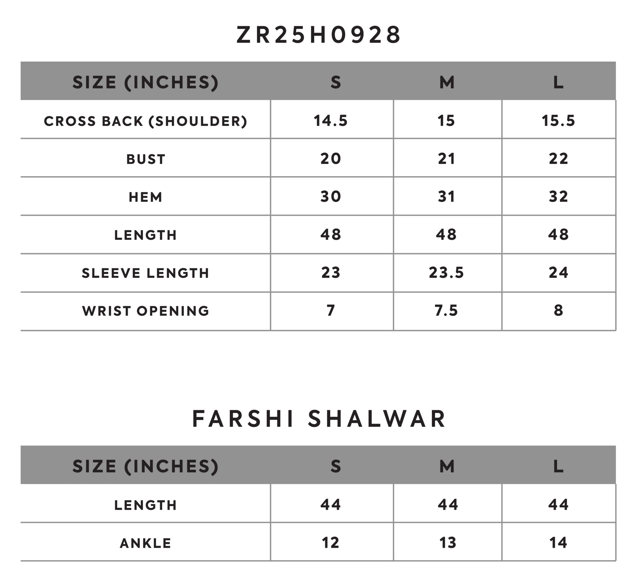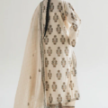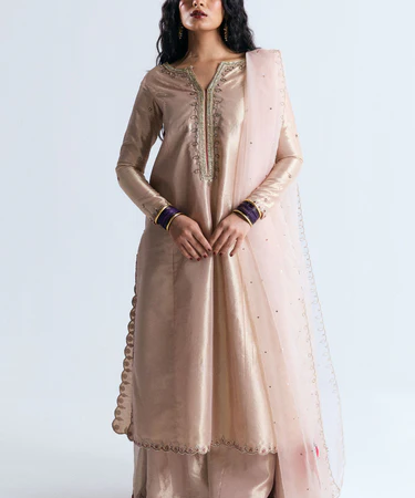 A five-panel long shirt cut from check dobby fabric anchors this handcrafted set with refined texture. It is styled with a farshi shalwar in breathable cambric, balancing tradition with ease. The ensemble is finished with a golden tilla jacquard check dupatta, its subtle shimmer lending depth and festive grace.