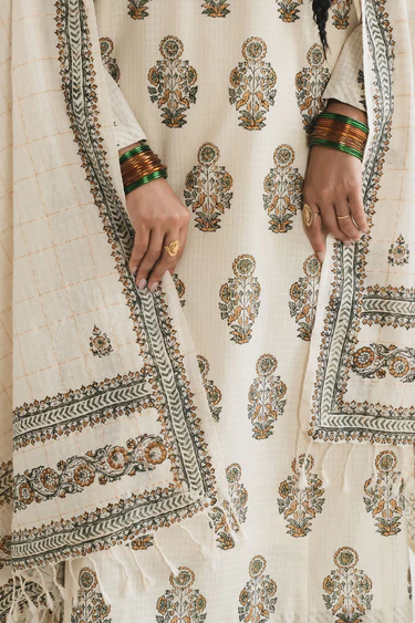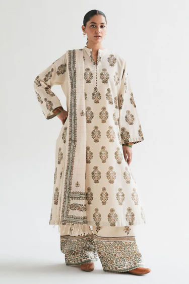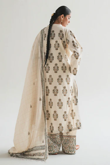 A five-panel long shirt cut from check dobby fabric anchors this handcrafted set with refined texture. It is styled with a farshi shalwar in breathable cambric, balancing tradition with ease. The ensemble is finished with a golden tilla jacquard check dupatta, its subtle shimmer lending depth and festive grace.